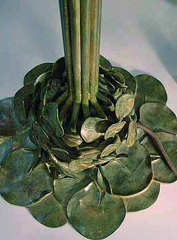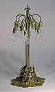 The suface of the lamp base and sockets are patinated with  green- brown Tiffany patina made in our Studio using the original recipe handed down by Tiffany Studios New York. No lacquer is used in the patination process.