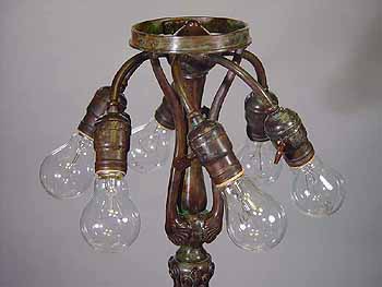 The suface of the lamp base and sockets are patinated with brown /dark green- brown Tiffany patina made in our Studio using the original recipe handed down by Tiffany Studios New York. No lacquer is used in the patination process.