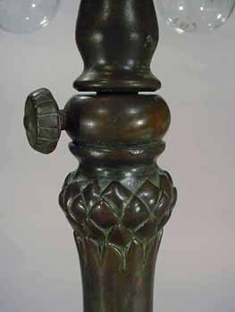 The suface of the lamp base and sockets are patinated with brown /dark green- brown Tiffany patina made in our Studio using the original recipe handed down by Tiffany Studios New York. No lacquer is used in the patination process.