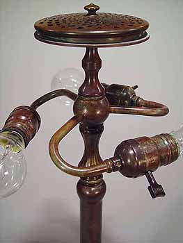 The suface of the lamp base and sockets are patinated with brown /dark green- brown Tiffany patina made in our Studio using the original recipe handed down by Tiffany Studios New York. No lacquer is used in the patination process.