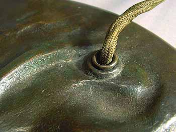 The suface of the lamp base and sockets are patinated with brown /dark green- brown Tiffany patina made in our Studio using the original recipe handed down by Tiffany Studios New York. No lacquer is used in the patination process.