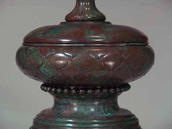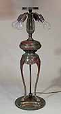 This base is wired according to US safety standards. It comes ready to use in the USA with new old style cloth covered lamp cord and standard US lamp sockets. Other standards of electrification are available at no extra cost. The suface of the lamp base and sockets are patinated with brown /dark green- brown Tiffany patina made in our Studio using the original recipe handed down by Tiffany Studios New York. No lacquer is used in the patination process.