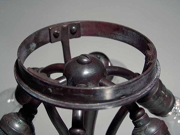 This base is wired according to US safety standards. It comes ready to use in the USA with new old style cloth covered lamp cord and standard US lamp sockets. Other standards of electrification are available at no extra cost. The suface of the lamp base and sockets are patinated with brown /dark green- brown Tiffany patina made in our Studio using the original recipe handed down by Tiffany Studios New York. No lacquer is used in the patination process.